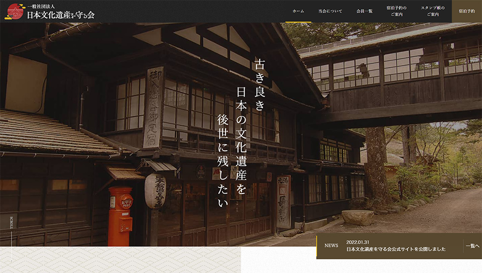 お知らせ ホーム お知らせ infomation一覧 日本文化遺産を守る会公式サイトを公開しました 日本文化遺産を守る会公式サイトを公開しました infomation 公開日:2022年01月31日 この度、一般社団法人 日本文化遺産を守る会公式サイトを公開いたしました。 本サイトでは当会の概要、活動報告を行ってまいります。 私たちが暮らしている日本には、後世に引き継ぐべき歴史的遺産や文化的遺産が数多く存在しています。 当会ではこれらの文化遺産を所有する旅館・ホテルのつながりをつくり、 個々が抱える情報を共有することで文化遺産の価値を理解してもらいながら、 世界に誇れる日本の文化遺産としての認識を高め、 社会をあげて後世に残すべき機運を高めていくことを目指します。 ・日本文化遺産を守る会について ・沿革 ・会員一覧 ・加盟希望の宿泊事業者様へ シェアする ツイートする LINEで送る